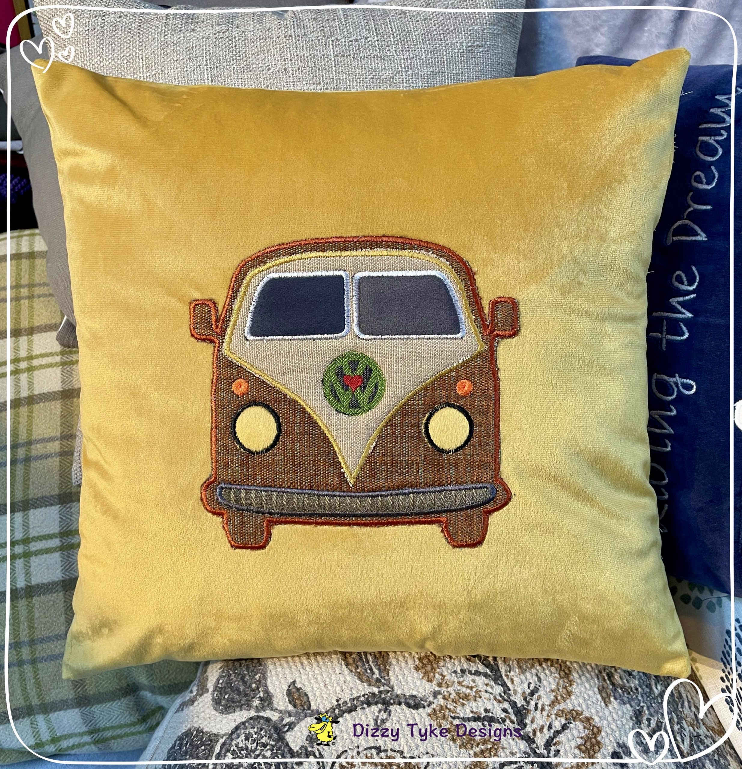 This camper van inspired design is embroidered and appliqué onto yellow/gold velvet feel curtain fabric. Perfect to treat yourself or as a gift for anyone who has a love of the classic camper.
