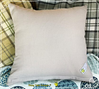 The Appliqué in wool and mixed fibre. The back is silver grey waffle fabric and has a zip . All raw fabric edges are overlocked to prevent fraying.