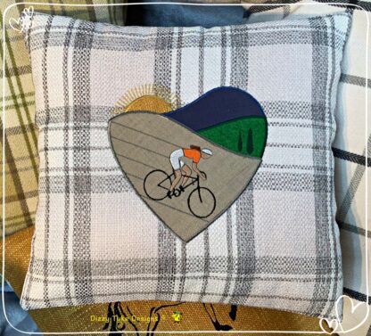 This cushion design is inspired by cycling in the countryside, featuring a female rider, it is created in appliqué and embroidery onto grey and link check curtain fabric.