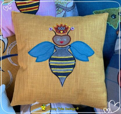 This Bee inspired design features a stylised queen bee with crown. The appliqué on gold/mustard boulce curtain fabric.