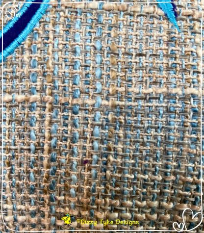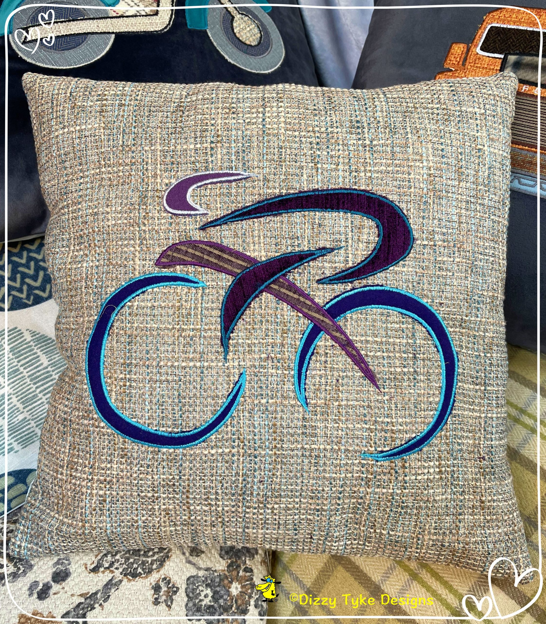 This contemporary design is inspired by the modern image of cycling, created in appliqué and embroidery on blue/grey open weave curtain fabric.