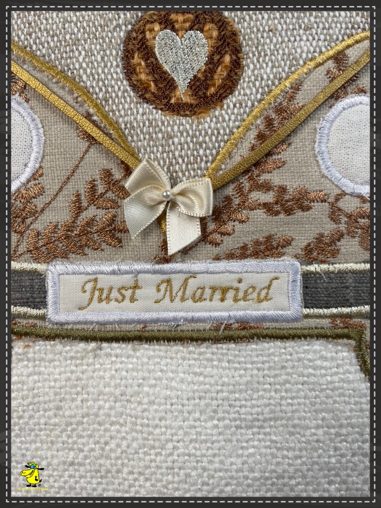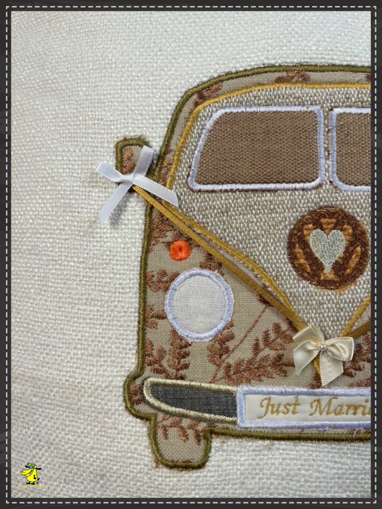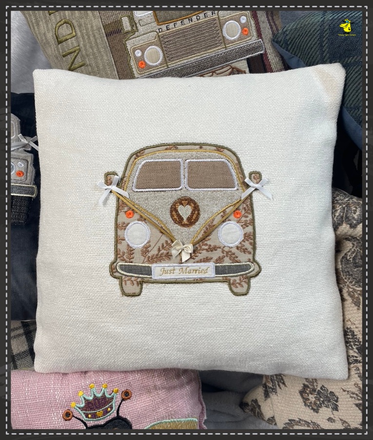 Using the old ‘sharabang’ as a wedding or going away car, then this Camper Van design has appliqué embroidered onto off white woven fabric if the perfect finishing touch.